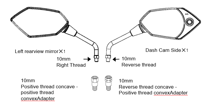 "The right mirror includes a 10mm P1.25 reverse-thread adapter plus a 10mm P1.25 standard-thread adapter.